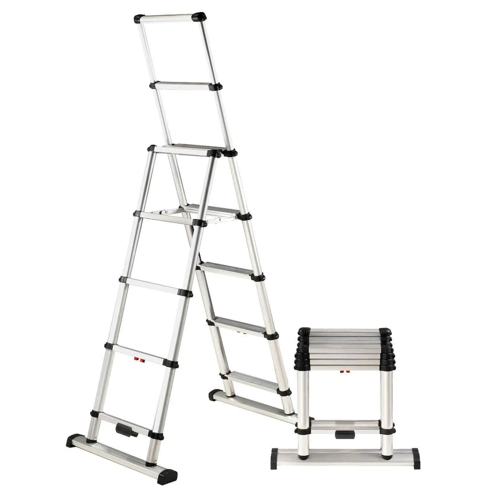 Las escaleras Telesteps Wide Step Telescoping A-Frame Combi son escaleras únicas que se pueden usar como una escalera de tijera o una escalera de extensión. Los modelos 10ES, 12ES y 14ES se pueden utilizar como escalera de tijera de 6' o escalera de extensión de 10', escalera de tijera de 8' o escalera de extensión de 12' y escalera de tijera de 10' o escalera de extensión de 14', respectivamente. Las escaleras Combi son excelentes para usar en superficies irregulares como escaleras. Estas escaleras combinadas telescópicas cuentan con extensión y retracción totalmente automáticas con un mecanismo patentado de liberación de un solo toque para facilitar su uso.