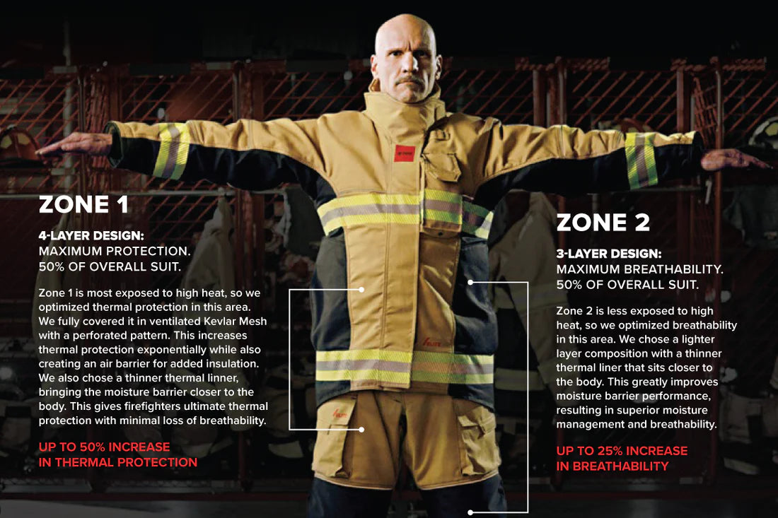 Innotex has completely rethought their patented Dual Metabolic Zone design to maximize thermal protection and breathability where they’re needed most. By splitting the coat and pant in two zones, firefighters get the best of protection, mobility and comfort.
